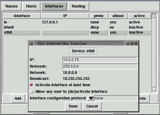 Network Configurator, indiqué à la Figure 15-2, vous permet de gérer facilement des paramètres, tels que les adresses IP, adresses passerelle et adresses réseau, de même que les serveurs de noms et /etc/hosts.