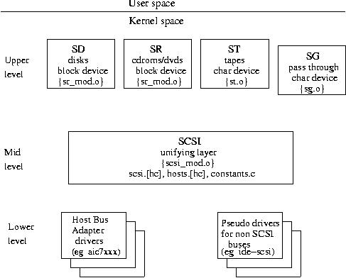 The upper level supports the user-kernel interface. In the case of sd and sr this is a block device interface while for st and sg this is a character device interface. Any operation using the SCSI subsystem (e.g. reading a sector from a disk) involves one driver at each of the 3 levels (e.g. sd, SCSI mid level and aic7xxx drivers).