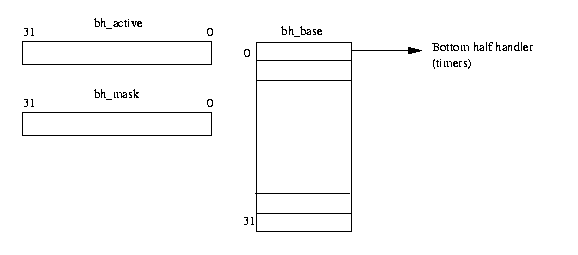 bh_active のビットは、個々のボトムハーフハンドラが呼び出されるたびに クリアされる。すなわち、bh_active は一時的なもので、スケジューラが 呼び出されたその時点では意味を持つが、次の呼び出しがなされる際には意味を持たな い。したがって、この方法を使えば、処理すべき仕事がない場合、ボトムハーフ処理 ルーチンは呼び出されない。