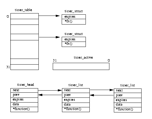 ひとつめは、古いタイマーメカニズムであり、 timer_struct データ構造体への 32 個のポインタによる静的配列と アクティブタイマーのマスク timer_active から構成されている。 タイマーがタイマーテーブル内のどこに置かれるかは、静的に定義されている。 (これは、ボトムハーフハンドラのテーブル bh_base にやや似ている。) エントリがこのテーブルに付け加えられるのは、大抵の場合システム起動時である。 ふたつめは、それより新しいメカニズムであり、 timer_list データ構造体の連結リストを使用する。リストの要素は、 タイマー終了までの残り時間(expire time)の長さの順番で並べられている。