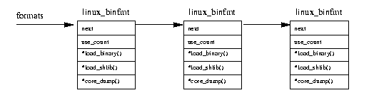 Linux は、多くの実行ファイルフォーマットをサポートしている。ELF はその ひとつであり、Java もそうである。プロセスがシステムの共有ライブラリを透過的 に扱えるようにしなければならないのと同様に、それらのファイルフォーマットも 透過的に扱われるよう管理されなければならない。