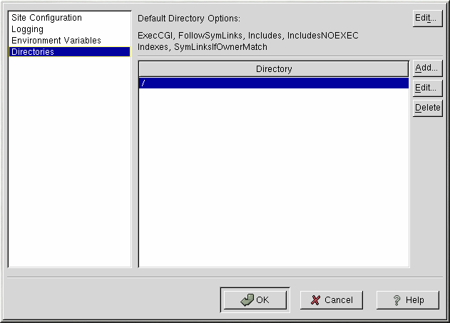 Verwenden Sie die Seite Directories, um die Optionen für bestimmte Verzeichnisse zu konfigurieren. Diese Option entspricht der Anweisung <Directory>.