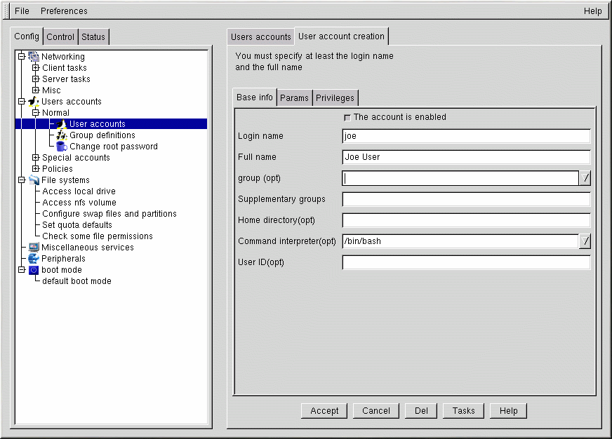 Der Bildschirm User account creation enthält die Abschnitte Basic Information, Params und Privileges. Es muss hier nur der Login name angegeben werden, doch sollten Sie auch die anderen Felder beachten, in denen es Ihnen freigestellt ist, ob Sie etwas eintragen.