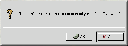 If this is the first time that you have used Apache Configuration Tool, you will see the dialog window shown in Figure 14-17, warning you that the configuration file has been manually modified. If Apache Configuration Tool detects that the httpd.conf configuration file has been manually modified, it will save the manually modified file as /etc/httpd/conf/httpd.conf.bak.