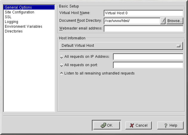 The General Options settings only apply to the virtual host that you are configuring. Set the name of the Virtual Host in the Virtual Host Name text area. This name is used by Apache Configuration Tool to distinguish between virtual hosts.