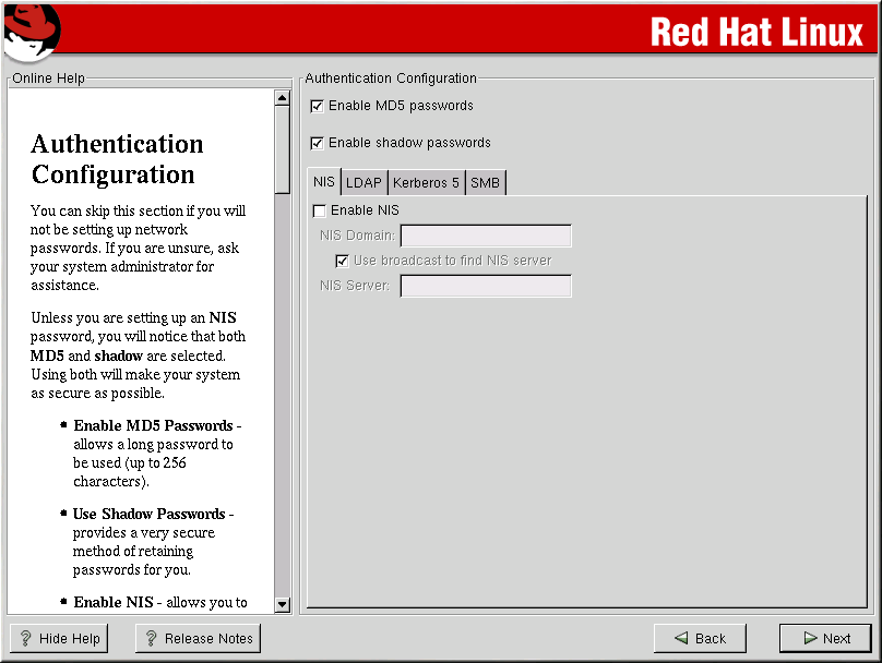 Enable Kerberos — Kerberos is a secure system for providing network authentication services. For more information about Kerberos, see Using Kerberos 5 on Red Hat Linux in the Official Red Hat Linux Reference Guide. There are three options to choose from here: