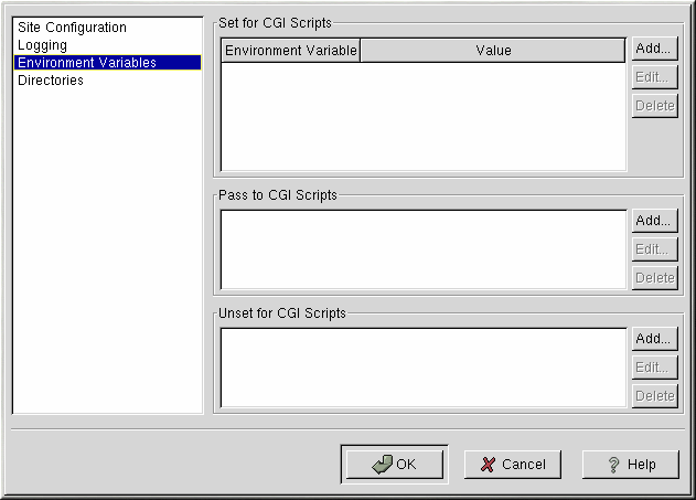 If you want to remove an environment variable so that the value is not passed to CGI scripts and SSI pages, use the Unset for CGI Scripts section. Click Add in the Unset for CGI Scripts section, and enter the name of the environment variable to unset. This corresponds to the UnsetEnv directive.
