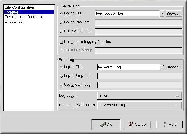 The error log contains a list of any server errors that occur. Enter the name of the path and file in which to store this information. If the path and filename does not start with a slash (/), the path is relative to the server root directory as configured. This option corresponds to the ErrorLog directive.