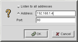 Use the Available Addresses area to define the ports on which Apache will accept incoming requests. This option corresponds to the Listen directive in httpd.conf. By default, Red Hat configures Apache to listen to port 80 for non-secure Web communications. Click the Add button to define additional ports on which to accept requests. A window as shown in Figure 13-2 will appear. Either choose the Listen to all addresses option to listen to all IP addresses on the defined port or specify a particular IP address over which the server will accept connections in the Address field. Only specify one IP address per port number. If you want to specify more than one IP address with the same port number, create an entry for each IP address. If at all possible, use an IP address instead of a domain name to prevent a DNS lookup failure. Refer to http://httpd.apache.org/docs/dns-caveats.html for more information about Issues Regarding DNS and Apache. Entering an asterisk (*) in the Address field is the same as choosing Listen to all addresses. Clicking the Edit button shows the same window as the Add button except with the fields populated for the selected entry. To delete an entry, select it and click the Delete button.