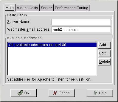 The Apache Configuration Tool allows you to configure the /etc/httpd/conf/httpd.conf configuration file for your Apache Web server. It does not use the old srm.conf or access.conf configuration files; leave them empty. Through the graphical interface, you can configure Apache directives such as virtual hosts, logging attributes, and maximum number of connections.