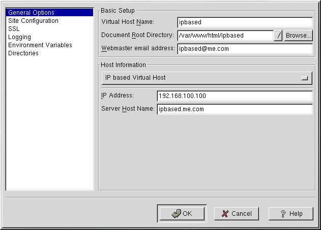 The Site Configuration, Environment Variables, and Directories options for the virtual hosts are the same directives that you set when you clicked the Edit Default Settings button, except the options set here are for the individual virtual hosts that you are configuring. Refer to the Section called Default Settings for details on these options.