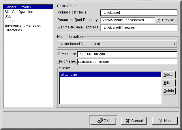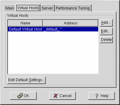 Apache Configuration Tool includes a default virtual host as shown in Figure 13-8. Refer to the Section called Default Virtual Host for details about the default virtual host.