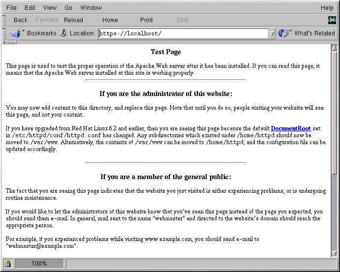 Point your Web browser to your server's home page. The URL to access your secure Web server will look like this: