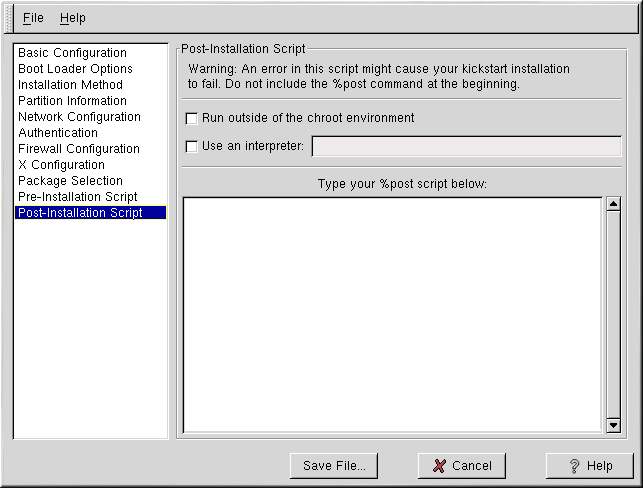 If you want to specify a scripting language to use to execute your script, click the Use an interpreter button and enter the interpreter in the text box beside the button. For example, /usr/bin/perl can be specified for a Perl script. This option corresponds to using %post --interpreter /usr/bin/perl in your kickstart file.