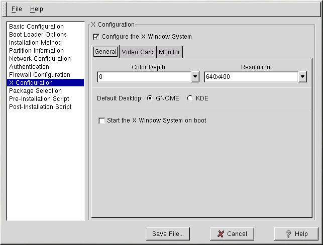 The first step in configuring X is to choose the default color depth and resolution. Select them from their respective pulldown menus. Be sure to specify a color depth and resolution that is compatible with the video card and monitor for the system.