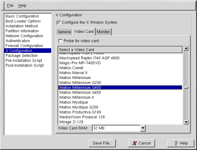 Alternatively, you can select the video card from the list on the Video Card tab as shown in Figure 2-10. Also select the amount of video RAM the selected video card has from the Video Card RAM pulldown menu. These values will be used by the installation program to configure the X Window System.