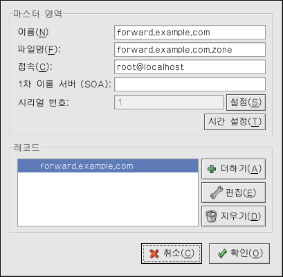Bind ¼³Á¤ µµ±¸ µµ±¸¸¦ »ç¿ëÇÏ¿© ¼ø¹æÇâ ¸¶½ºÅÍ ¿µ¿ª (forward master zone), ¿ª¹æÇâ ¸¶½ºÅÍ ¿µ¿ª (reverse master zone)°ú ½½·¹ÀÌºê ¿µ¿ª (slave zone)À» Ãß°¡ °¡´ÉÇÕ´Ï´Ù. ¿µ¿ªÀ» Ãß°¡ÇϽŠÈÄ ±×¸² 21-1¿¡¼ º¸ÀÌ´Â °Í°ú °°Àº ±âº» â¿¡¼ Ãß°¡ÇϽŠ¿µ¿ªÀ» ÆíÁýÇϰųª »èÁ¦ÇÏ½Ç ¼ö ÀÖ½À´Ï´Ù.