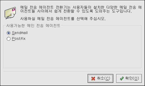 Red Hat Linux 9´Â µÎ°¡Áö Á¾·ùÀÇ MTA: Sendmail°ú Postfix¸¦ Á¦°øÇÕ´Ï´Ù. µÎ°¡Áö ¸ðµÎ ¼³Ä¡µÈ °æ¿ì, sendmailÀÌ ±âº» MTA ÀÔ´Ï´Ù. ¸¸ÀÏ ±âº» MTA¸¦ º¯°æÇϽ÷Á¸é, ¸ÞÀÏ Àü¼Û ¿¡ÀÌÀüÆ® º¯È¯±â¸¦ »ç¿ëÇÏ¿© sendmail À̳ª postfix¸¦ ¼±ÅÃÇÏ½Ç ¼ö ÀÖ½À´Ï´Ù.